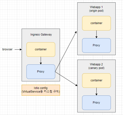 이제 Webapp에 접근할때도, 프록시를 통해 카나리를 적용할 수 있다. Istio Gateway도 그저 어플리케이션 앞에 존재하는 프록시라고 생각하면 쉽다. 제일 앞단에 커스텀 트래픽 규칙을 정의하는 것이다.