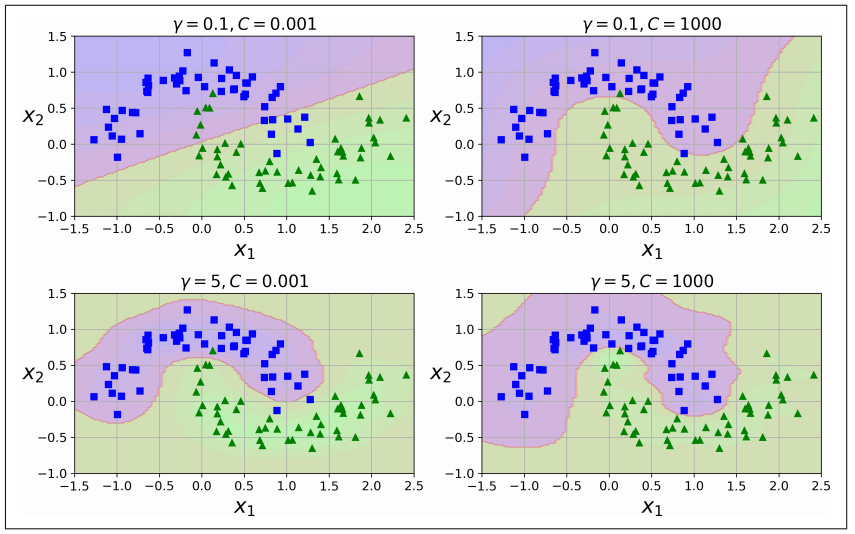 - 작은 gamma 값은 넓은 종 모양 그래프를 만들고 샘플이 넓은 범위에 걸쳐 영향을 주므로 결정 경계가 더 부드러워짐