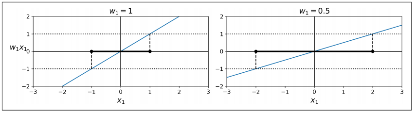 - 이 비용 함수의 첫번째 항은 모델이 작은 가중치 벡터 w를 가지도록 제약을 가해 마진을 크게 만듬