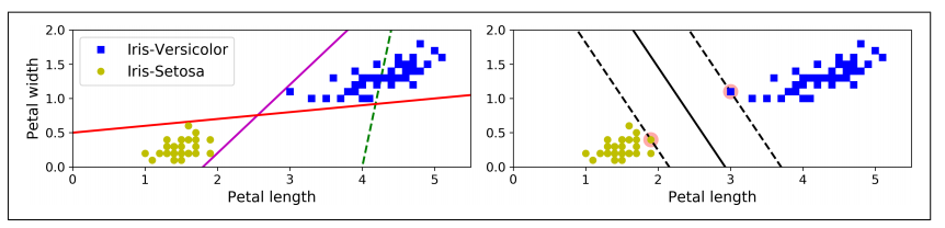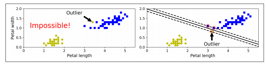 모든 샘플이 도로 바깥쪽에 올바르게 분류되어 있으면 하드 마진 분류라고 하는데, 하드 마진 분류에는 두 가지 문제점이 있음