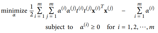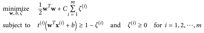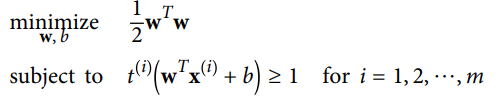 - 아래와 같이 하드 마진 선형 SVM 분류기의 목적 함수를 제약이 있는 최적화 문제로 표현할 수 있음