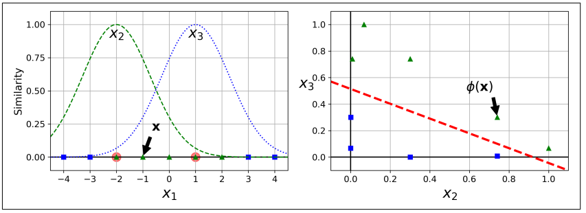 - 따라서 새로 만든 특성은 x2=exp(-0.3x1^2) 와 x3=exp(-0.3x2^2)