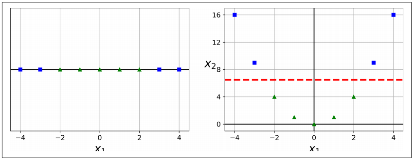 - 오른쪽은 두번째 특성 X2=X1^2 을 추가하여 만들어진 2차원 데이터셋 => 선형적으로 구분 가능