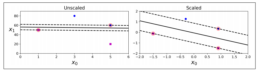 - 오른쪽 그래프처럼 특성의 스케일을 조정하면(ex. 사이킷런의 StandardScaler 사용) 결정 경계가 훨씬 좋아짐