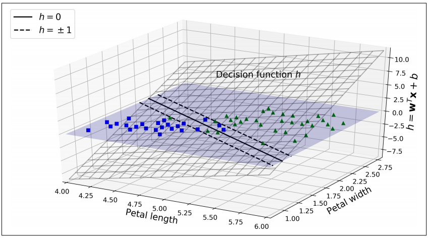 - 특성이 두 개(꽃잎 너비와 길이)인 데이터셋이기 때문에 2차원 평면임