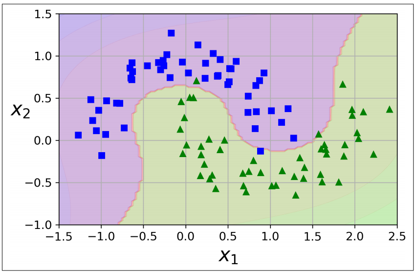 선형적으로 분류할 수 없는 비선형 데이터셋을 다루는 방법은 4장에서처럼 다항 특성과 같은 특성을 더 추가하는 것