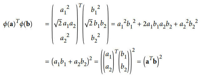 - 두 개의 2차원 벡터 a와 b에 2차 다항식 매핑을 적용한 다음 변환된 벡터로 점곱을 하면 다음과 같음