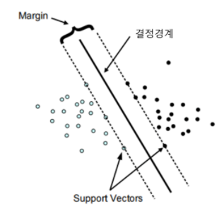 - 데이터를 선형으로 분리하는 최적의 선형 결정 경계를 찾는 알고리즘
