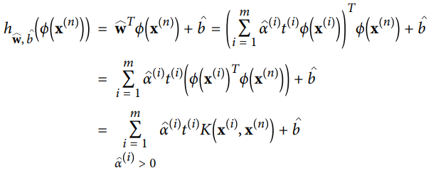 - 식 "쌍대 문제에서 구한 해로 원 문제 해 계산하기" 의 w hat에 대한 식을 새로운 샘플 x^(n)의 결정 함수에 적용해서 입력 벡터 간의 점곱으로만 된 식을 얻을 수 있음