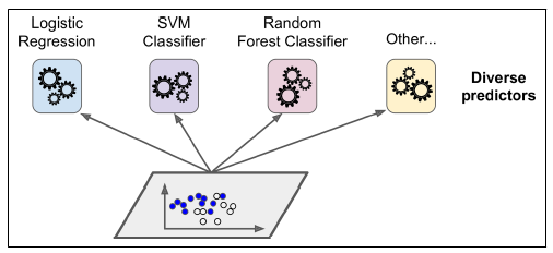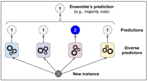 - 이때 일련의 예측기를 앙상블이라고 하기 때문에