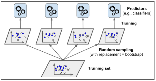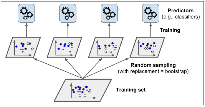 다양한 분류기를 만드는 또 다른 방법으로 같은 알고리즘을 사용하고 훈련 세트의 서브셋을 무작위로 구성하여 분류기를 각기 다르게 학습시키는 방법