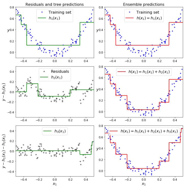- 세 번째 행에서는 또 다른 트리가 두 번째 트리의 잔여 오차에 훈련