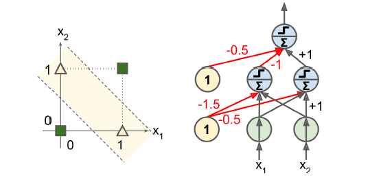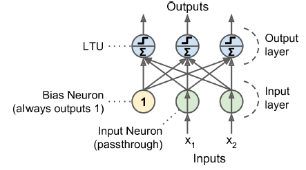 - 퍼셉트론을 하나의 TLU를 가진 작은 네트워크를 의미하는 용도로 사용하곤 함
