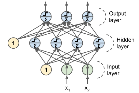 - 출력층을 제외하고 모든 층은 편향 뉴런을 포함하며 다음 층과 완전히 연결되어 있음