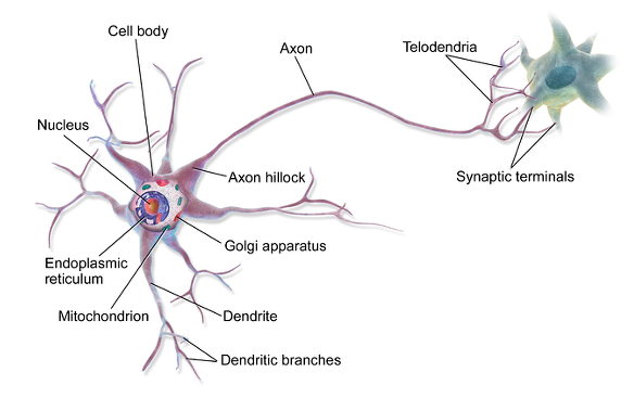 - 각각의 뉴런은 수상돌기(Dendrite)를 통해 다른 뉴런에서 신호를 받아서 축삭돌기(Axon)를 통해 다른 뉴런으로 신호를 보냄