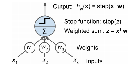 - TLU는 입력의 가중치 합을 계산(z = w1x1+w2x2+...+x^Tw)한 뒤 계산된 합에 계단 함수를 적용하여 결과를 출력 => hx(x) = step(z), (z = x^Tw)