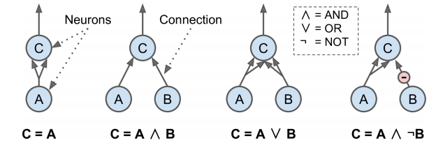 - 뉴런 A가 활성화되고 뉴련 B가 비활성화될 때 뉴런 C가 활성화 됨