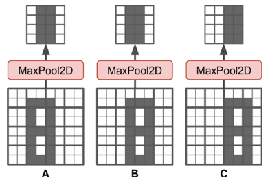 - 이미지 A와 B에서 최대 풀링층의 출력은 동일 -> 이동 불변성