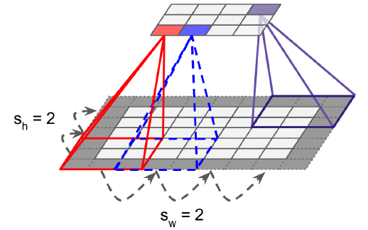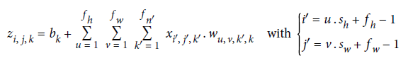 - sh와 sw는 수직과 수평 스트라이드이고, fh와 fw는 수용장의 높이와 너비, fn'는 이전 층(l-1층)에 있는 특성 맵의 수