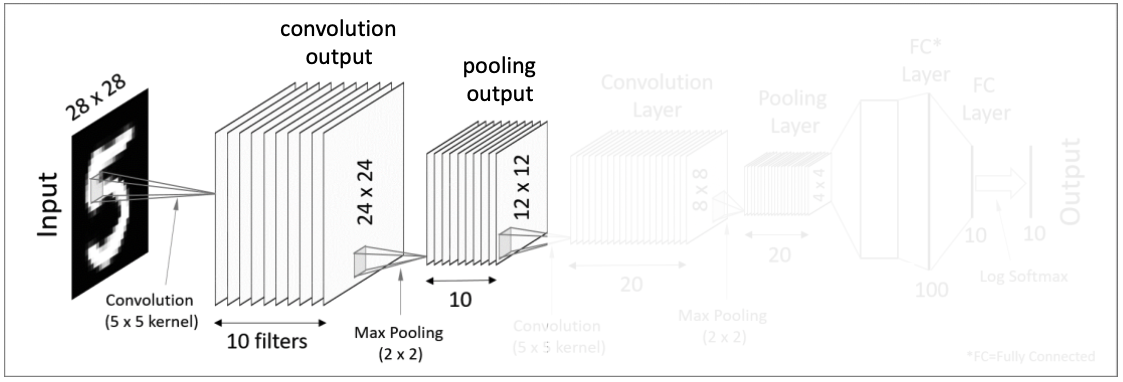 - 한 개의 28x28 이미지 입력값에 10개의 5x5 필터를 사용하여 24x24x10 matrix가 나오게 됨