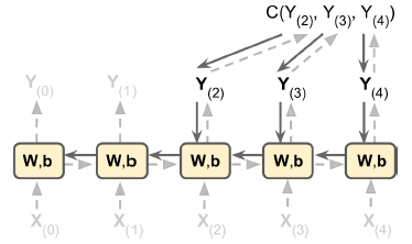 (그림에서는 비용함수 계산시 Y(2),(3),(4) 를 사용했기 때문에 그래디언트는 이 세개의 출력을 거쳐 흐르지만 Y(0)과 Y(1)은 거치치 않음)