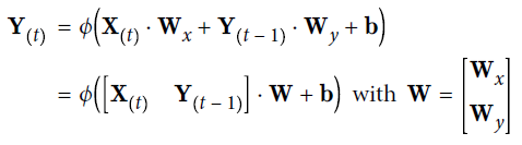 - 타임 스텝 t마다 모든 뉴런은 입력 벡터 x(t)와 이전 타임 스텝의 출력 벡터 y(t-1)을 받음 => 입력과 출력이 모두 벡터
