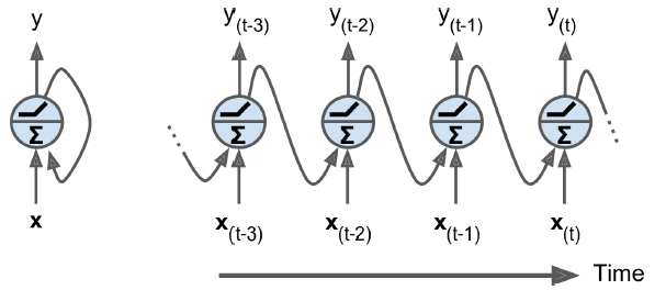 - 각 타임스텝 t(또는 프레임) 마다 이 순환 뉴런은 물론 x(t)와 이전 타임 스텝의 출력인 y(t-1)을 입력으로 받음
