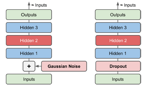 인코더의 입력에 적용한 Dropout 층이 있는 (또는 GaussianNoise층 사용) 적층 오토인코더